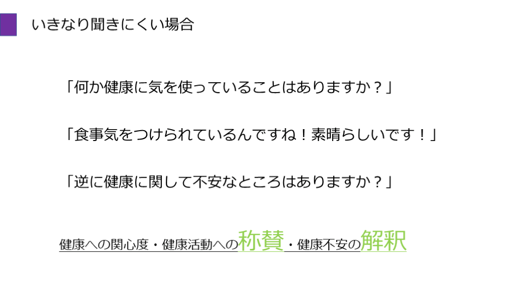 #14. いきなり聞きにくい場合 「何か健康に気を使っていることはありますか?」 「食事気をつけられているんですね!素晴らしいです!」 「逆に健康に関して不安なところはありますか?」 健康への関心度・健康活動への称賛・健康不安の解釈