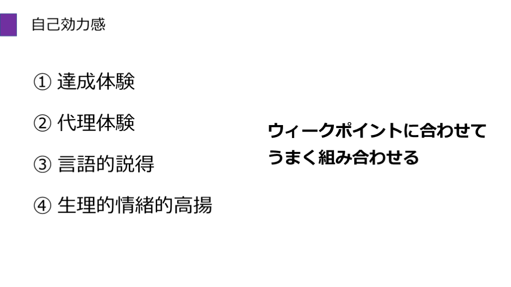 #23. 自己効力感 ① 達成体験 ② 代理体験 ③ 言語的説得 ④ 生理的情緒的高揚 ウィークポイントに合わせて