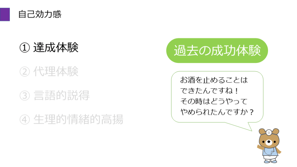 #24. 自己効力感 ① 達成体験 ② 代理体験 ③ 言語的説得 ④ 生理的情緒的高揚 過去の成功体験 お酒を止めることは