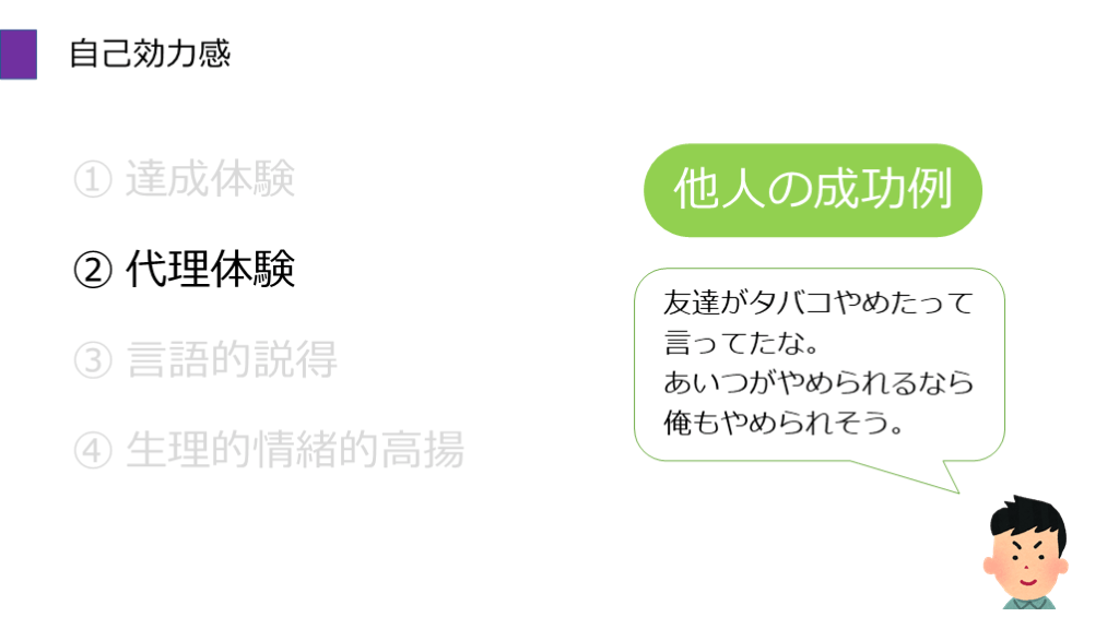 #25. 自己効力感 ① 達成体験 ② 代理体験 ③ 言語的説得 ④ 生理的情緒的高揚 他人の成功例 友達がタバコやめたって