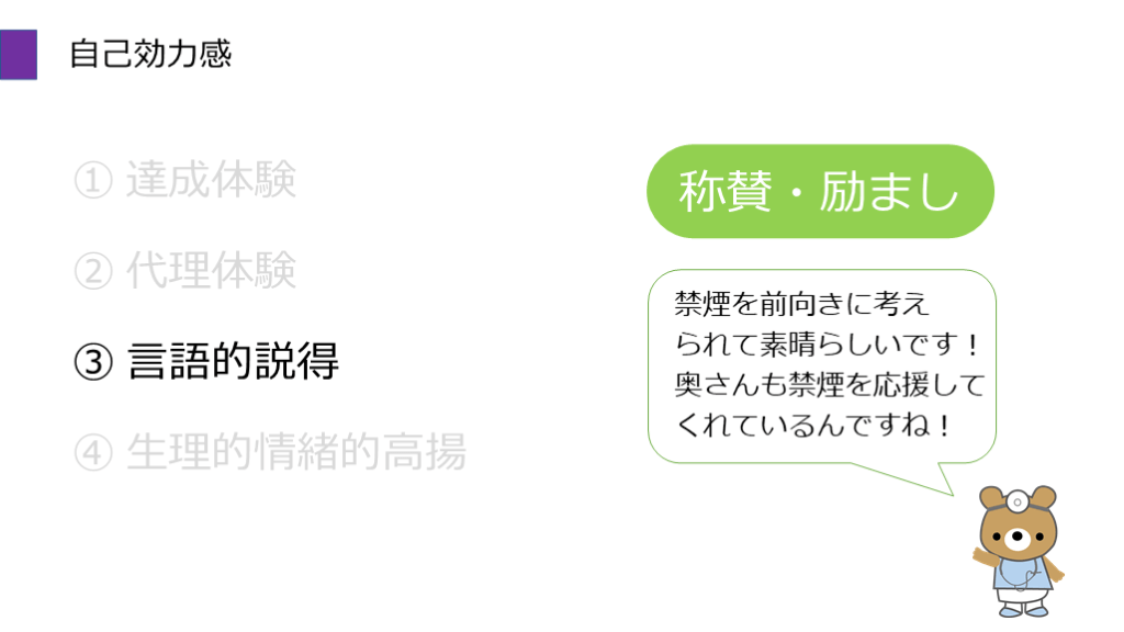#26. 自己効力感 ① 達成体験 ② 代理体験 ③ 言語的説得 ④ 生理的情緒的高揚 称賛・励まし 禁煙を前向きに考え