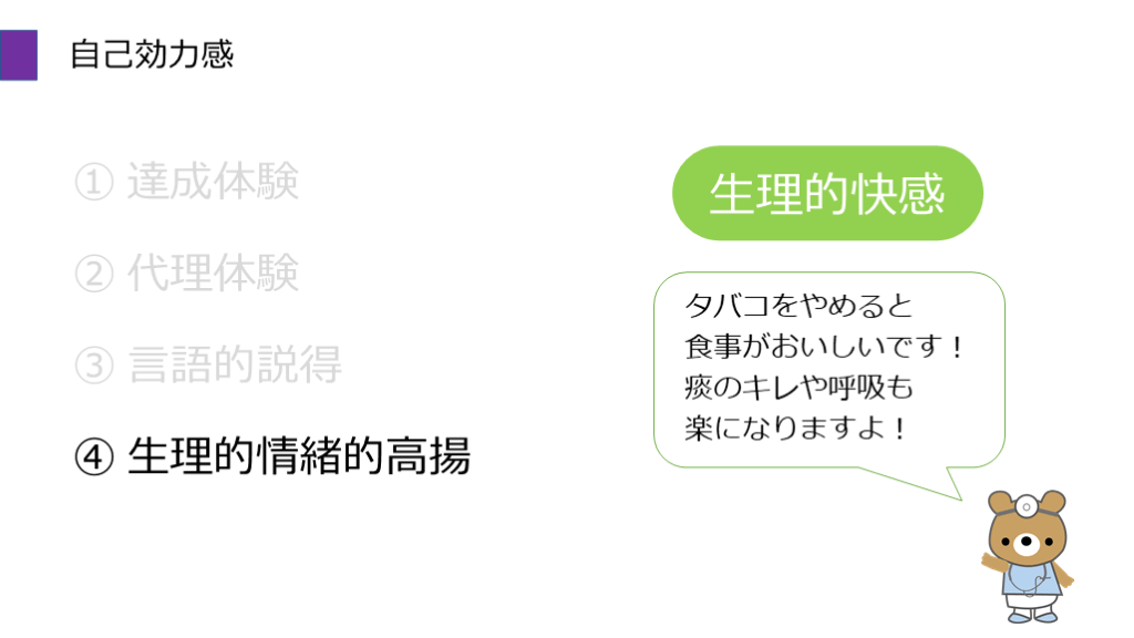 #27. 自己効力感 ① 達成体験 ② 代理体験 ③ 言語的説得 ④ 生理的情緒的高揚 生理的快感 タバコをやめると