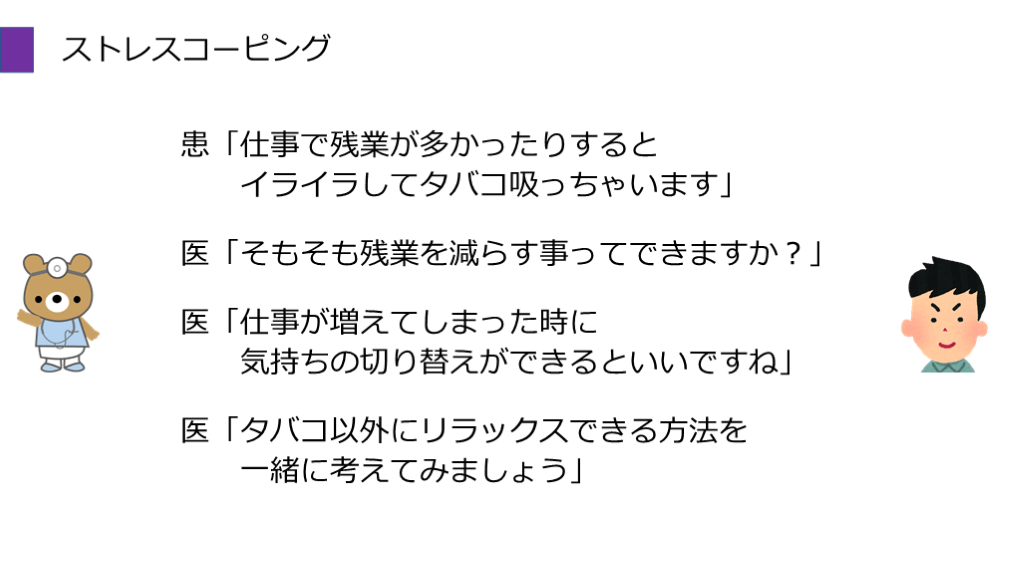 気持ちの切り替えができるといいですね」 医「タバコ以外にリラックスできる方法を