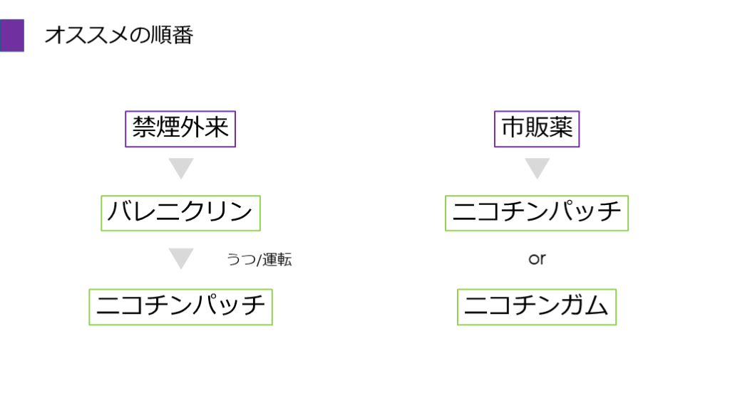 #47. オススメの順番 禁煙外来 バレニクリン ニコチンパッチ 市販薬 ニコチンパッチ ニコチンガム or うつ/運転