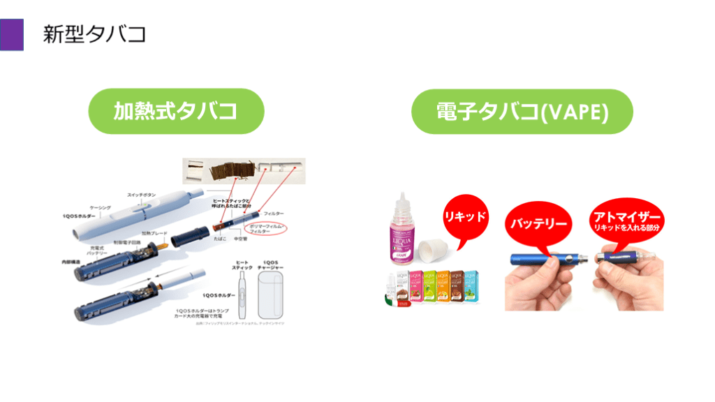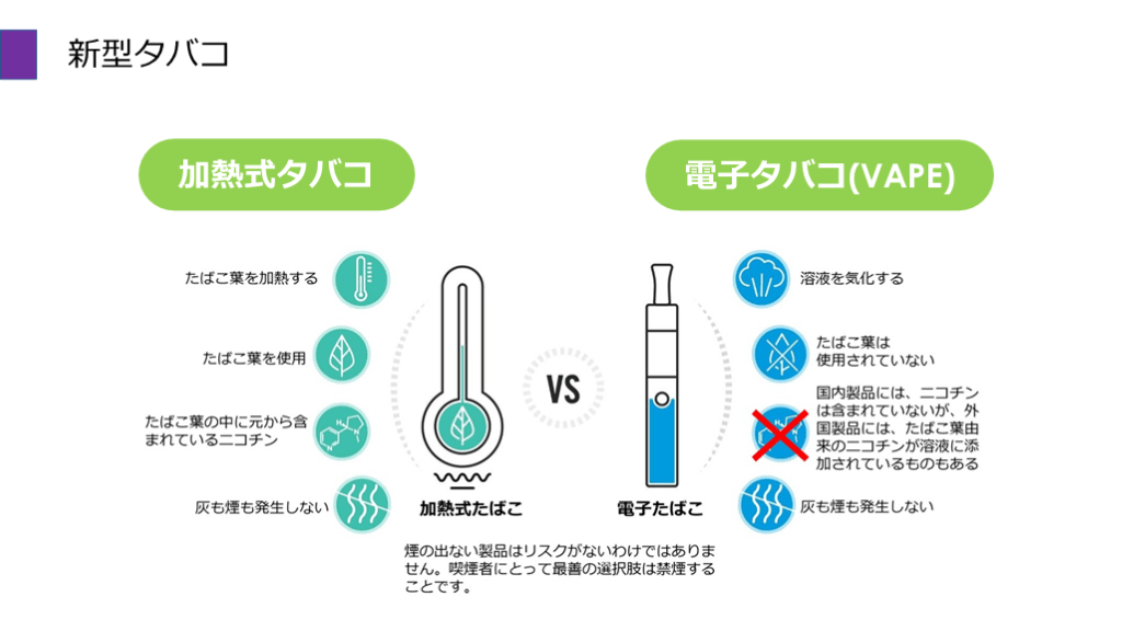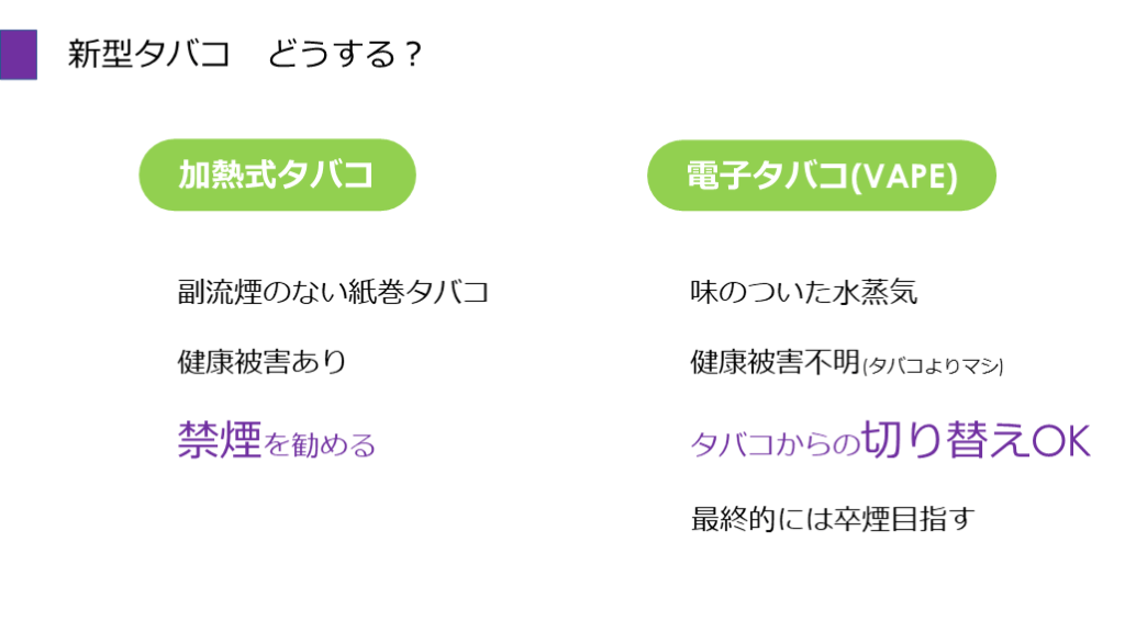 #55. 新型タバコ どうする? 副流煙のない紙巻タバコ 健康被害あり 禁煙を勧める 味のついた水蒸気 健康被害不明(タバコよりマシ) タバコからの切り替えOK 最終的には卒煙目指す