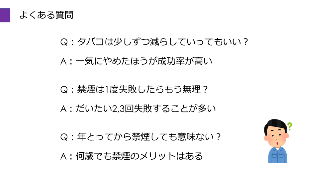 #56. よくある質問 Q:タバコは少しずつ減らしていってもいい? A:一気にやめたほうが成功率が高い Q:禁煙は1度失敗したらもう無理? A:だいたい2,3回失敗することが多い Q:年とってから禁煙しても意味ない? A:何歳でも禁煙のメリットはある