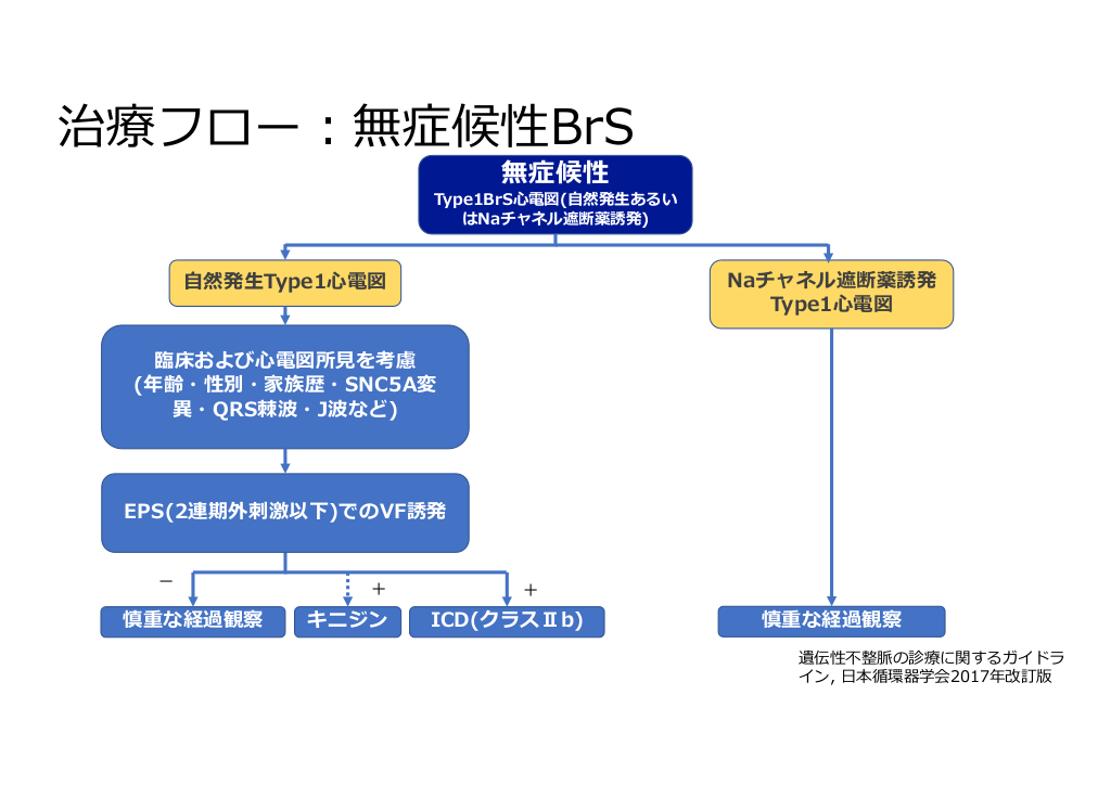 #10. 治療フロー︓無症候性BrS 無症候性 Type1BrS⼼電図(⾃然発⽣あるい はNaチャネル遮断薬誘発) Naチャネル遮断薬誘発 Type1⼼電図 ⾃然発⽣Type1⼼電図 臨床および⼼電図所⾒を考慮 (年齢・性別・家族歴・SNC5A変 異・QRS棘波・J波など) EPS(2連期外刺激以下)でのVF誘発 − 慎重な経過観察 + キニジン + ICD(クラスⅡb) 慎重な経過観察 遺伝性不整脈の診療に関するガイドラ イン, ⽇本循環器学会2017年改訂版