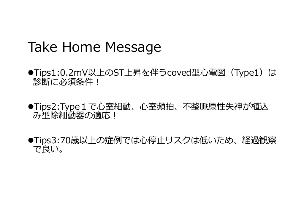 #11. Take Home Message lTips1:0.2mV以上のST上昇を伴うcoved型⼼電図(Type1)は 診断に必須条件︕ lTips2:Type1で⼼室細動、⼼室頻拍、不整脈原性失神が植込 み型除細動器の適応︕ lTips3:70歳以上の症例では⼼停⽌リスクは低いため、経過観察 で良い。