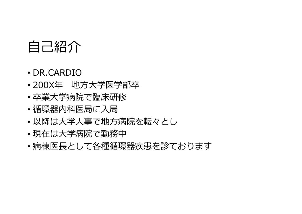 #2. ⾃⼰紹介 • DR.CARDIO • 200X年 地⽅⼤学医学部卒 • 卒業⼤学病院で臨床研修 • 循環器内科医局に⼊局 • 以降は⼤学⼈事で地⽅病院を転々とし • 現在は⼤学病院で勤務中 • 病棟医⻑として各種循環器疾患を診ております
