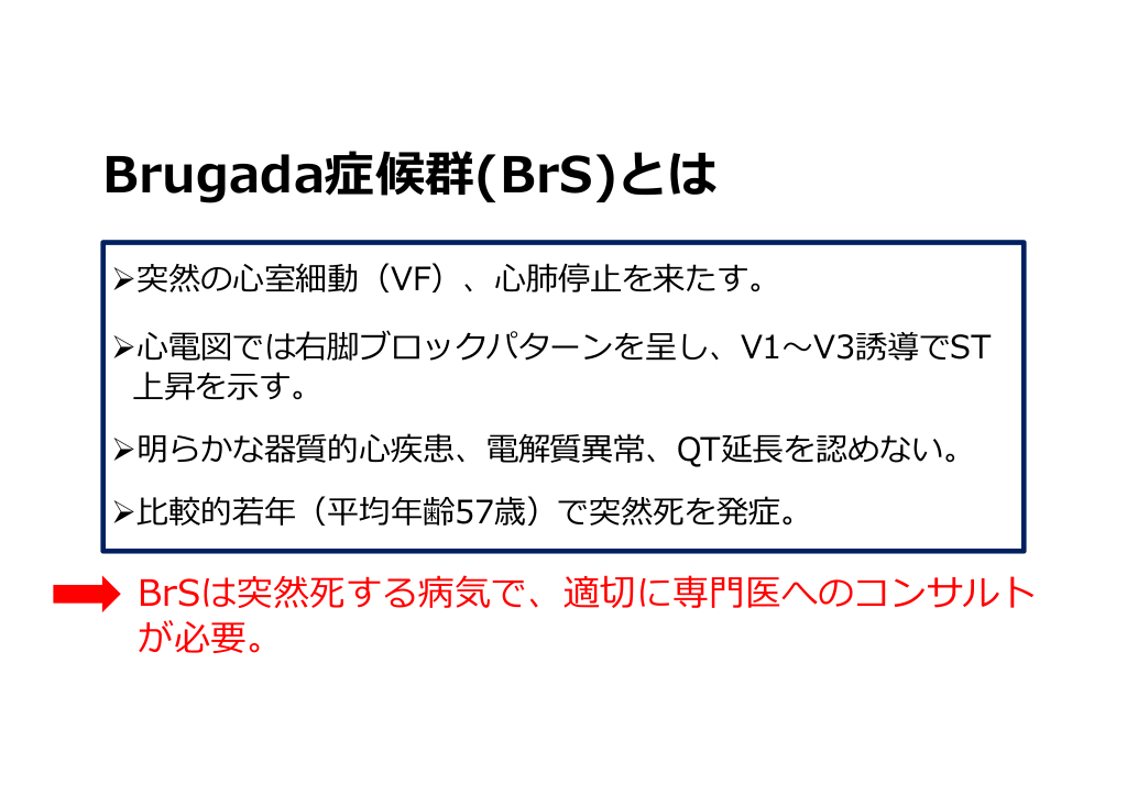 #3. Brugada症候群(BrS)とは Ø突然の⼼室細動(VF)、⼼肺停⽌を来たす。 Ø⼼電図では右脚ブロックパターンを呈し、V1〜V3誘導でST 上昇を⽰す。 Ø明らかな器質的⼼疾患、電解質異常、QT延⻑を認めない。 Ø⽐較的若年(平均年齢57歳)で突然死を発症。 BrSは突然死する病気で、適切に専⾨医へのコンサルト が必要。