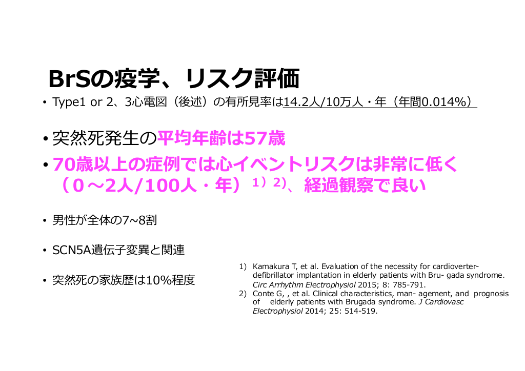 #4. BrSの疫学、リスク評価 • Type1 or 2、3⼼電図(後述)の有所⾒率は14.2⼈/10万⼈・年(年間0.014%) • 突然死発⽣の平均年齢は57歳 • 70歳以上の症例では⼼イベントリスクは⾮常に低く (0〜2⼈/100⼈・年)1)2)、経過観察で良い • 男性が全体の7~8割 • SCN5A遺伝⼦変異と関連 • 突然死の家族歴は10%程度 1) Kamakura T, et al. Evaluation of the necessity for cardioverterdefibrillator implantation in elderly patients with Bru- gada syndrome. Circ Arrhythm Electrophysiol 2015; 8: 785-791. 2) Conte G, , et al. Clinical characteristics, man- agement, and prognosis of elderly patients with Brugada syndrome. J Cardiovasc Electrophysiol 2014; 25: 514-519.