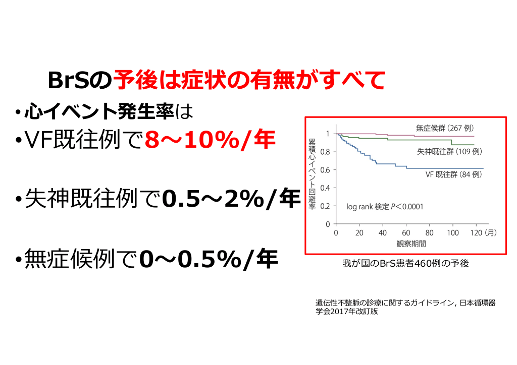 #5. BrSの予後は症状の有無がすべて • ⼼イベント発⽣率は •VF既往例で8〜10%/年 •失神既往例で0.5〜2%/年 •無症候例で0〜0.5%/年 我が国のBrS患者460例の予後 遺伝性不整脈の診療に関するガイドライン, ⽇本循環器 学会2017年改訂版