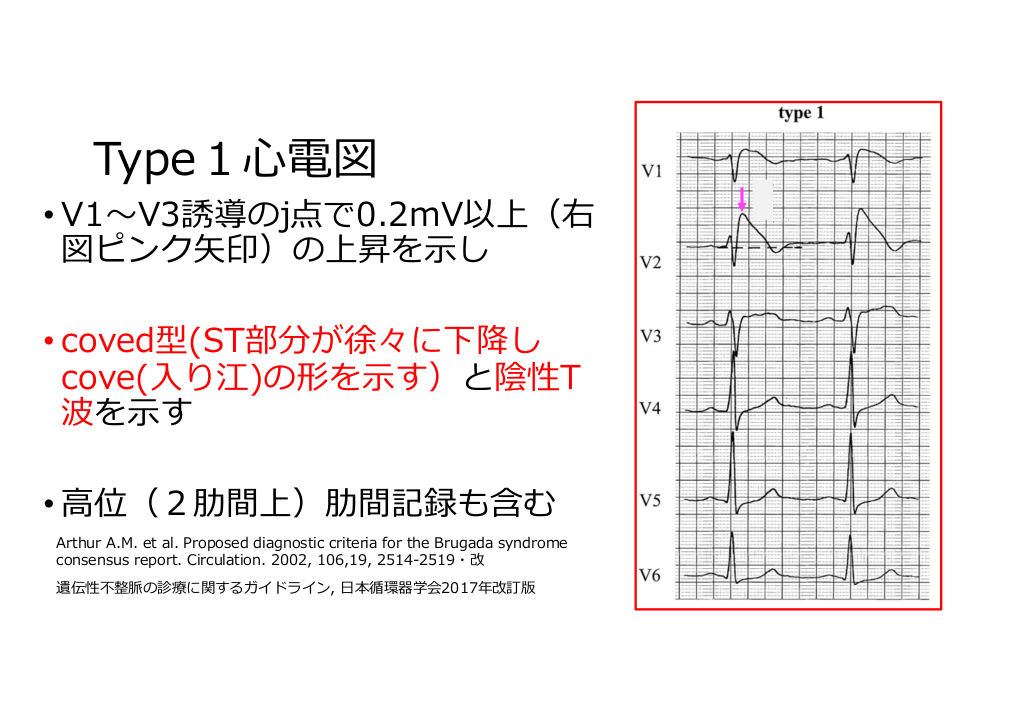 #6. Type1⼼電図 • V1〜V3誘導のj点で0.2mV以上(右 図ピンク⽮印)の上昇を⽰し • coved型(ST部分が徐々に下降し cove(⼊り江)の形を⽰す)と陰性T 波を⽰す • ⾼位(2肋間上)肋間記録も含む Arthur A.M. et al. Proposed diagnostic criteria for the Brugada syndrome consensus report. Circulation. 2002, 106,19, 2514-2519・改 遺伝性不整脈の診療に関するガイドライン, ⽇本循環器学会2017年改訂版