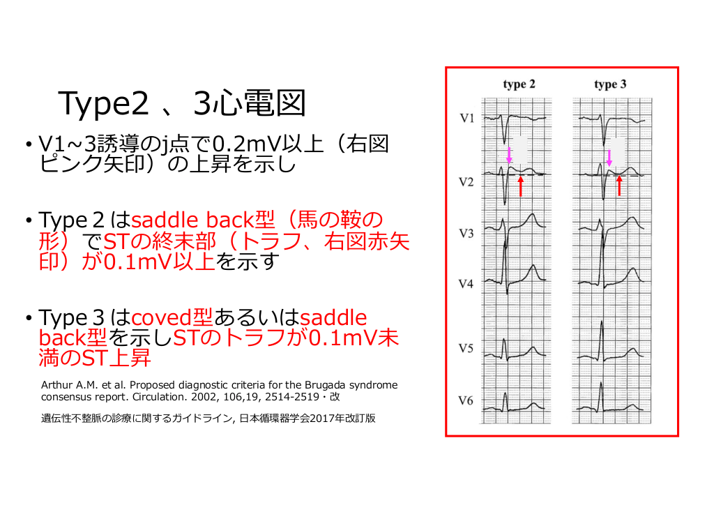 #7. Type2 、3⼼電図 • V1~3誘導のj点で0.2mV以上(右図 ピンク⽮印)の上昇を⽰し • Type2はsaddle back型(⾺の鞍の 形)でSTの終末部(トラフ、右図⾚⽮ 印)が0.1mV以上を⽰す • Type3はcoved型あるいはsaddle back型を⽰しSTのトラフが0.1mV未 満のST上昇 Arthur A.M. et al. Proposed diagnostic criteria for the Brugada syndrome consensus report. Circulation. 2002, 106,19, 2514-2519・改 遺伝性不整脈の診療に関するガイドライン, ⽇本循環器学会2017年改訂版