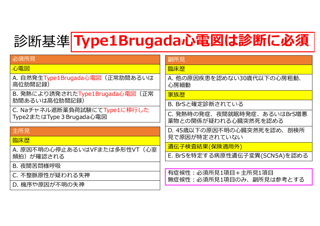 #8. 診断基準 Type1Brugada⼼電図は診断に必須 必須所⾒ 副所⾒ ⼼電図 臨床歴 A. ⾃然発⽣Type1Brugada⼼電図(正常肋間あるいは ⾼位肋間記録) A. 他の原因疾患を認めない30歳代以下の⼼房粗動、 ⼼房細動 B. 発熱により誘発されたType1Brugada⼼電図(正常 肋間あるいは⾼位肋間記録) 家族歴 C. Naチャネル遮断薬負荷試験にてType1に移⾏した Type2またはType3Brugada⼼電図 主所⾒ 臨床歴 A. 原因不明の⼼停⽌あるいはVFまたは多形性VT(⼼室 頻拍)が確認される B. 夜間苦悶様呼吸 C. 不整脈原性が疑われる失神 D. 機序や原因が不明の失神 B. BrSと確定診断されている C. 発熱時の発症、夜間就眠時発症、あるいはBrS増悪 薬物との関係が疑われる⼼臓突然死を認める D. 45歳以下の原因不明の⼼臓突然死を認め、剖検所 ⾒で原因が特定されていない 遺伝⼦検査結果(保険適⽤外) E. BrSを特定する病原性遺伝⼦変異(SCN5A)を認める 有症候性︓必須所⾒1項⽬+主所⾒1項⽬ 無症候性︓必須所⾒1項⽬のみ、副所⾒は参考とする