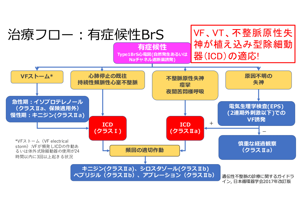#9. 治療フロー︓有症候性BrS 有症候性 Type1BrS⼼電図(⾃然発⽣あるいは Naチャネル遮断薬誘発) VFストーム* ⼼肺停⽌の既往 持続性頻脈性⼼室不整脈 VF、VT、不整脈原性失 神が植え込み型除細動 器(ICD)の適応! 原因不明の 失神 不整脈原性失神 痙攣 夜間苦悶様呼吸 急性期︓イソプロテレノール (クラスⅡa、保険適⽤外) 慢性期︓キニジン(クラスⅡa) ICD (クラスⅠ) *VFストーム(VF electrical storm):VFが頻発しICDの作動あ るいは体外式除細動器の使⽤が24 時間以内に3回以上起きる状況 ICD (クラスⅡa) + 頻回の適切作動 キニジン(クラスⅡa)、シロスタゾール(クラスⅡb) ベプリジル(クラスⅡb)、アブレーション(クラスⅡb) 電気⽣理学検査(EPS) (2連期外刺激以下)での VF誘発 − 慎重な経過観察 (クラスⅡa) 遺伝性不整脈の診療に関するガイドラ イン, ⽇本循環器学会2017年改訂版