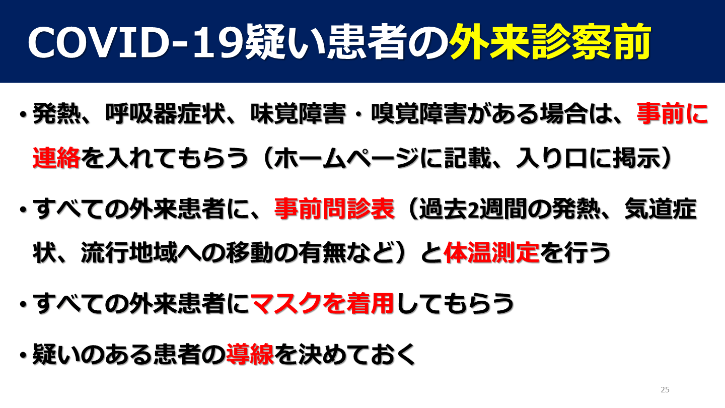 COVID-19疑い患者の外来診察前 発熱、呼吸器症状、味覚障害・嗅覚障害がある場合は、事前に連絡を入れてもらう(ホームページに記載、入り口に掲示)