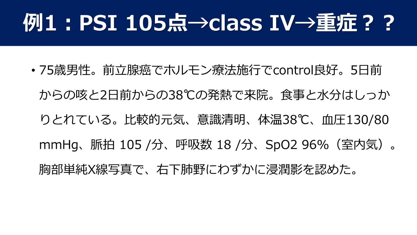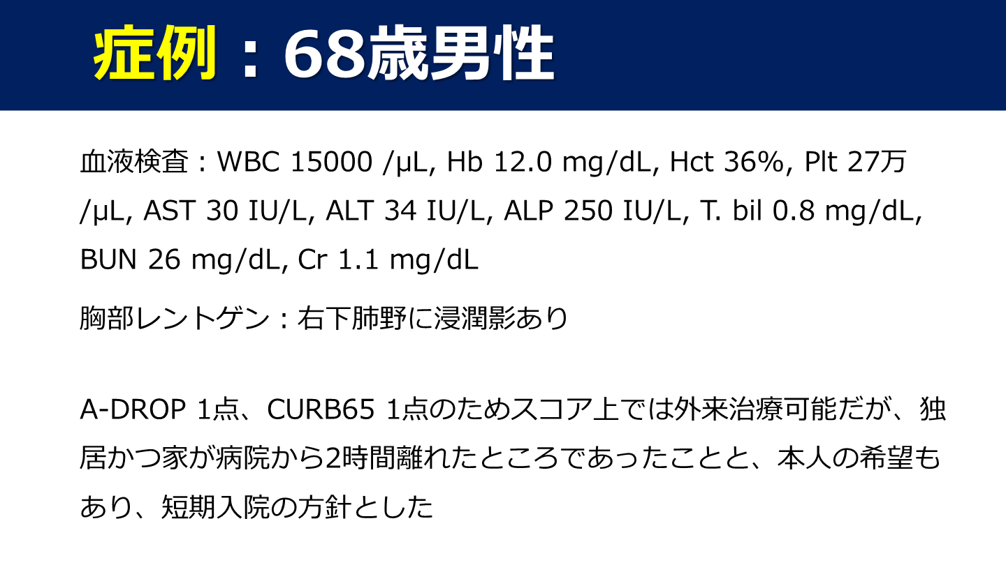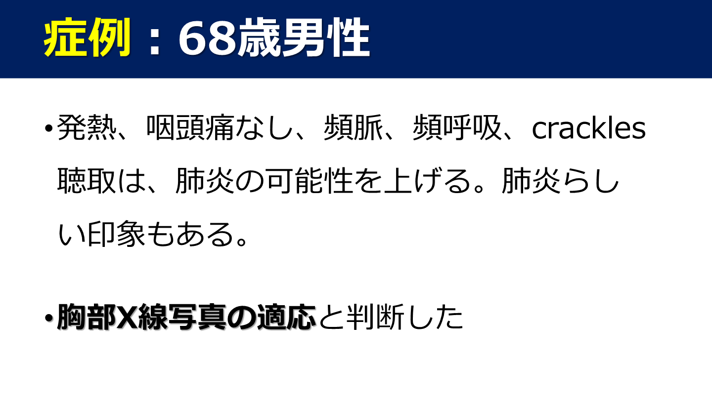 症例:68歳男性 発熱、咽頭痛なし、頻脈、頻呼吸、crackles聴取は、肺炎の可能性を上げる。肺炎らしい印象もある。