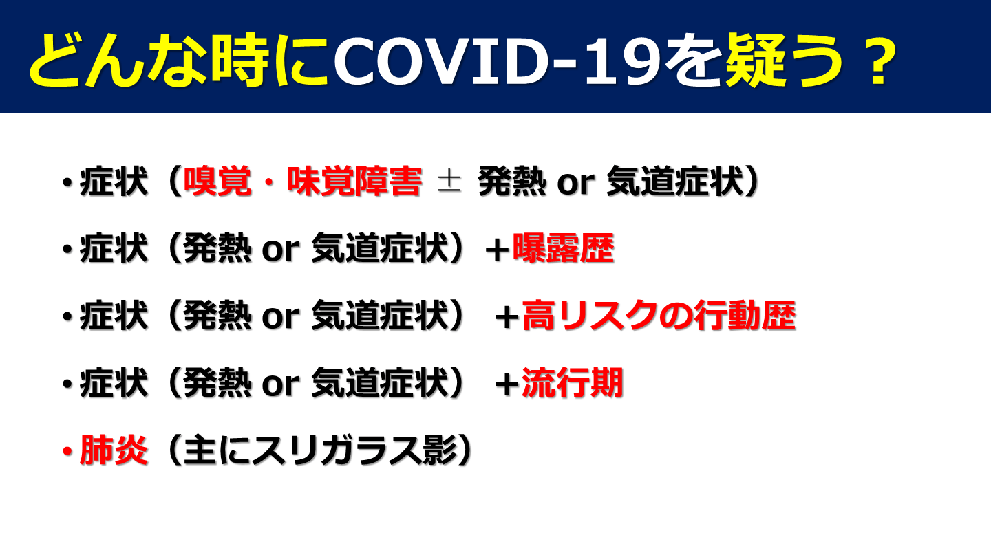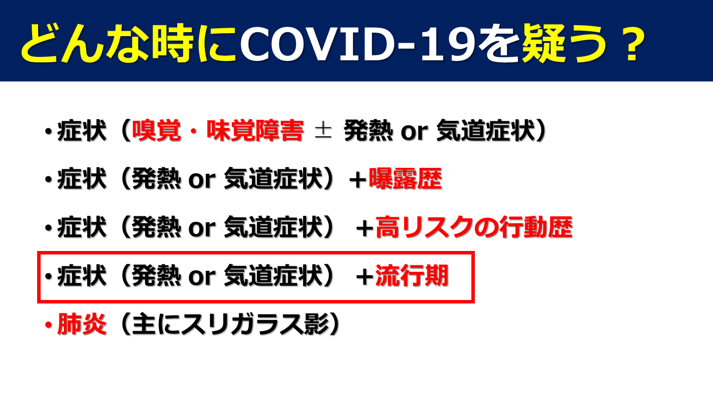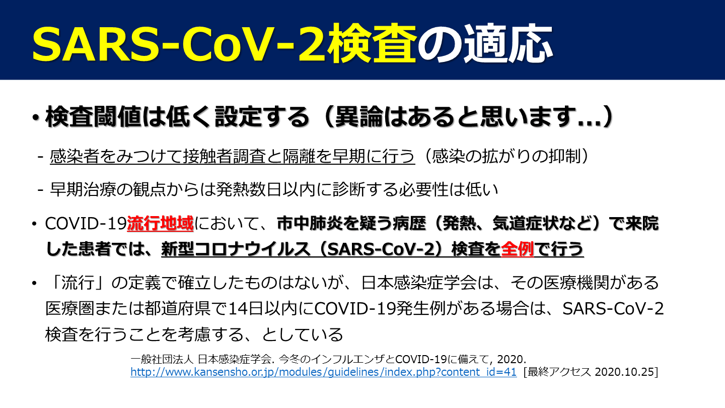 COVID-19流行期は、感染対策を行い、PCR検査の閾値は低くする
