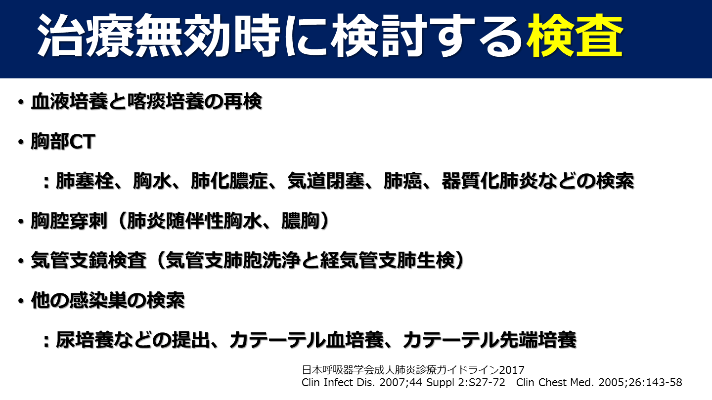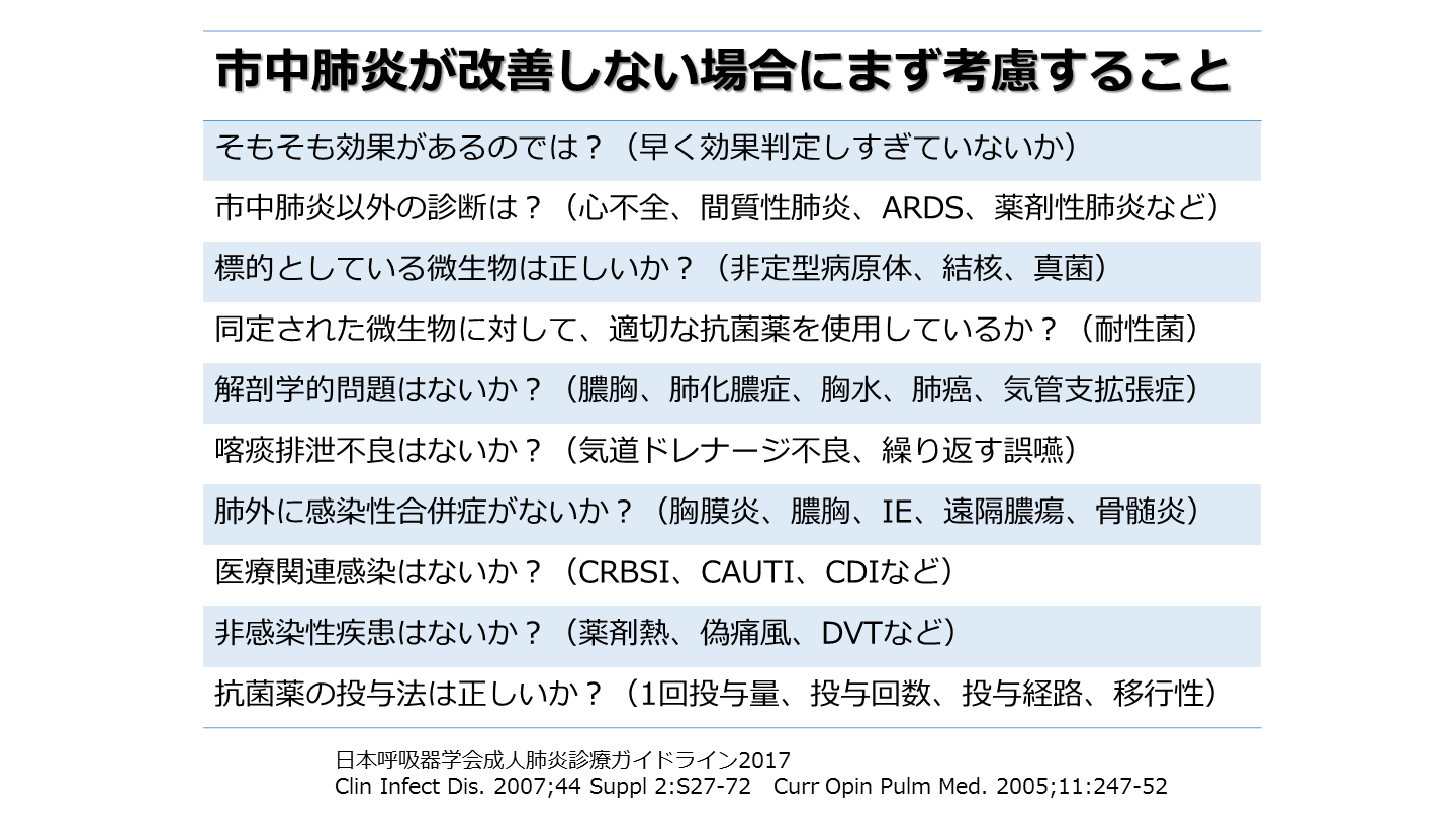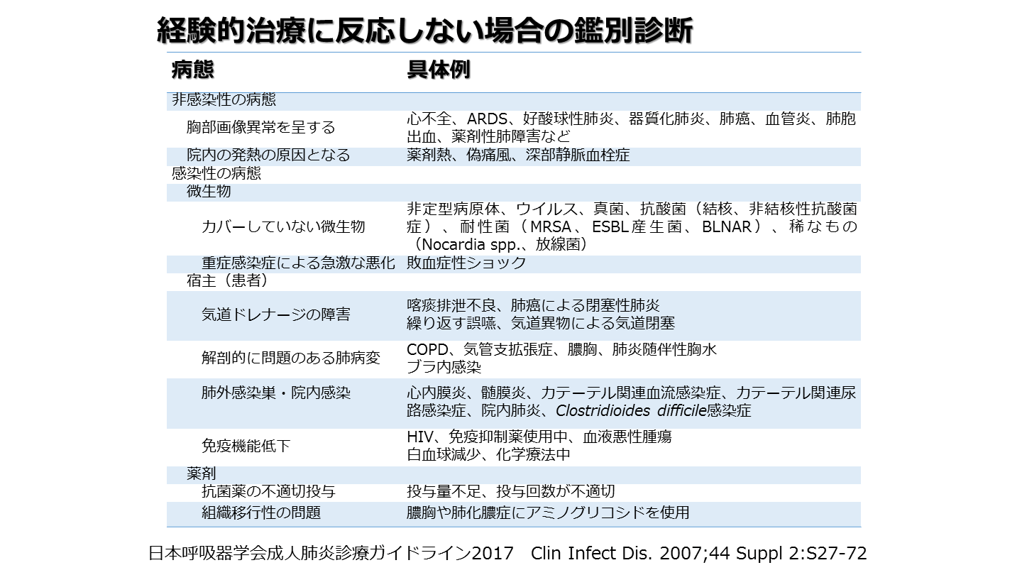 経験的治療に反応しない場合の鑑別診断 日本呼吸器学会成人肺炎診療ガイドライン2017 Clin Infect Dis. 2007;44 Suppl 2:S27-72 #213.