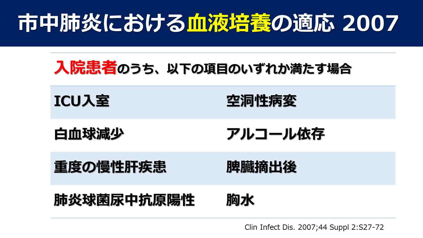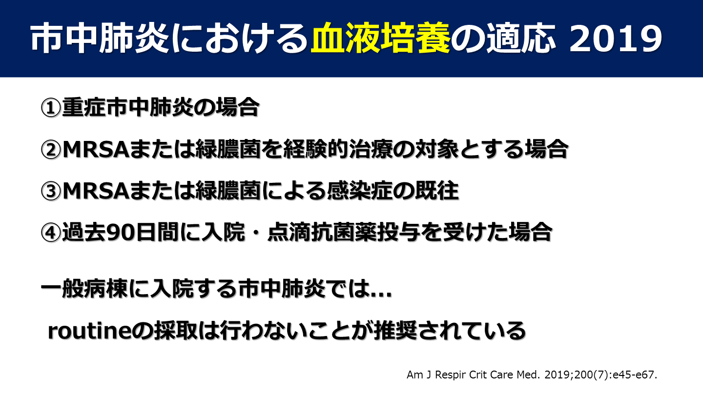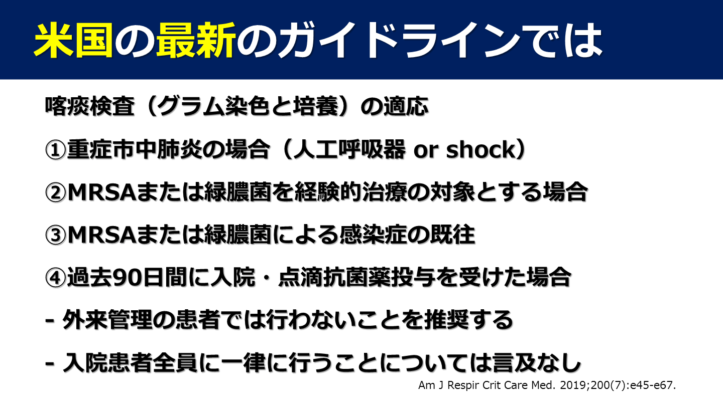 - 喀痰検査(グラム染色・喀痰培養)と血液培養の適応