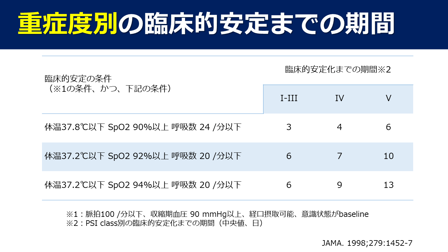 重症度別の臨床的安定までの期間 ※1:脈拍100 /分以下、収縮期血圧 90 mmHg以上、経口摂取可能、意識状態がbaseline