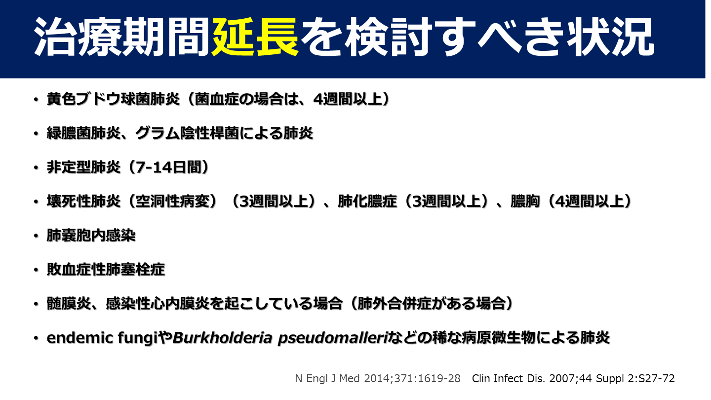 治療期間延長を検討すべき状況 黄色ブドウ球菌肺炎(菌血症の場合は、4週間以上)
