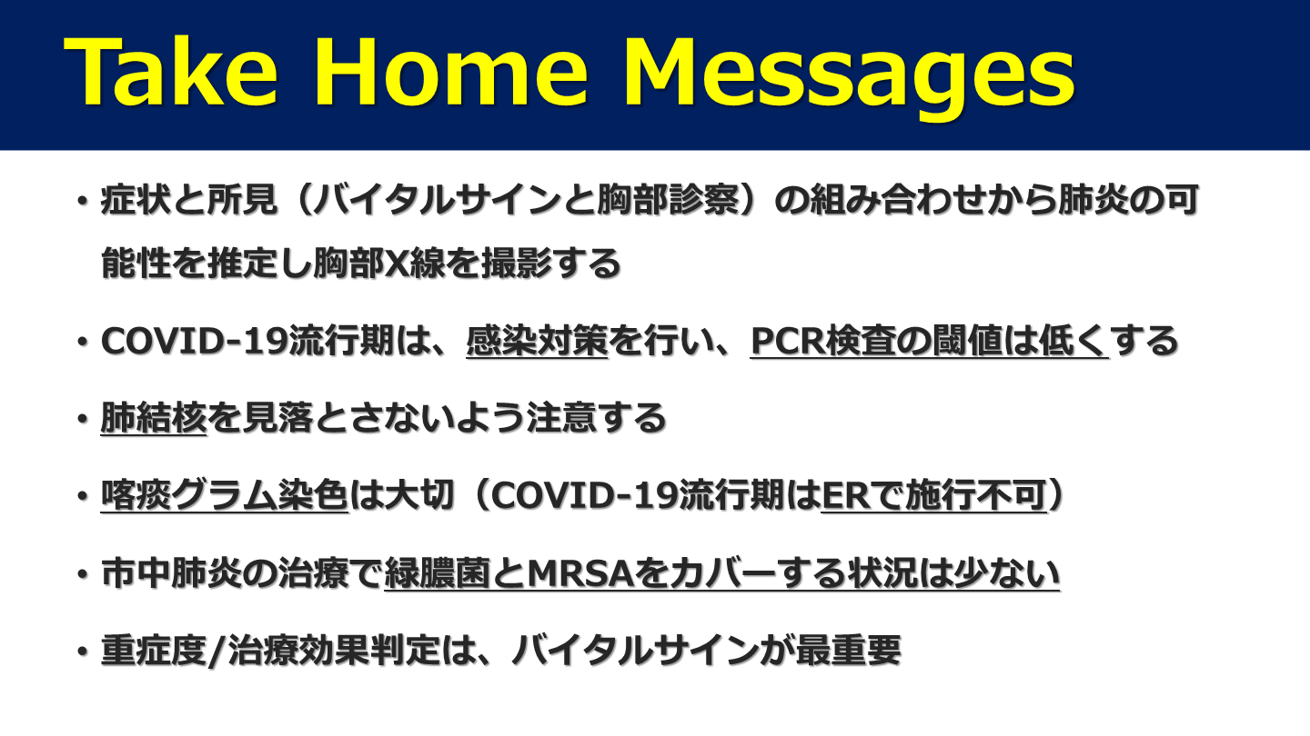 Take Home Messages 症状と所見(バイタルサインと胸部診察)の組み合わせから肺炎の可能性を推定し胸部X線を撮影する