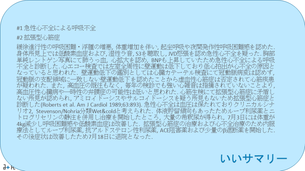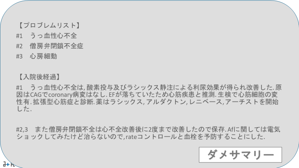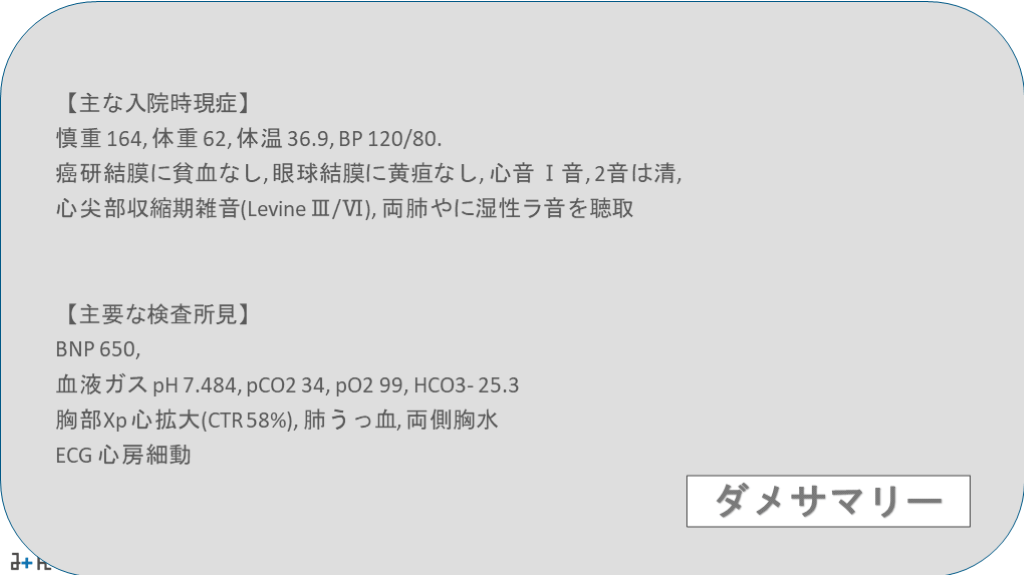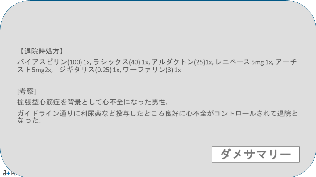 ガイドライン通りに利尿薬など投与したところ良好に心不全がコントロールされて退院となった. ダメサマリー