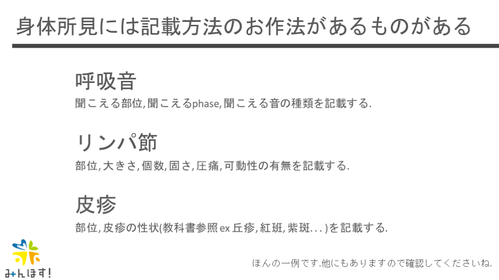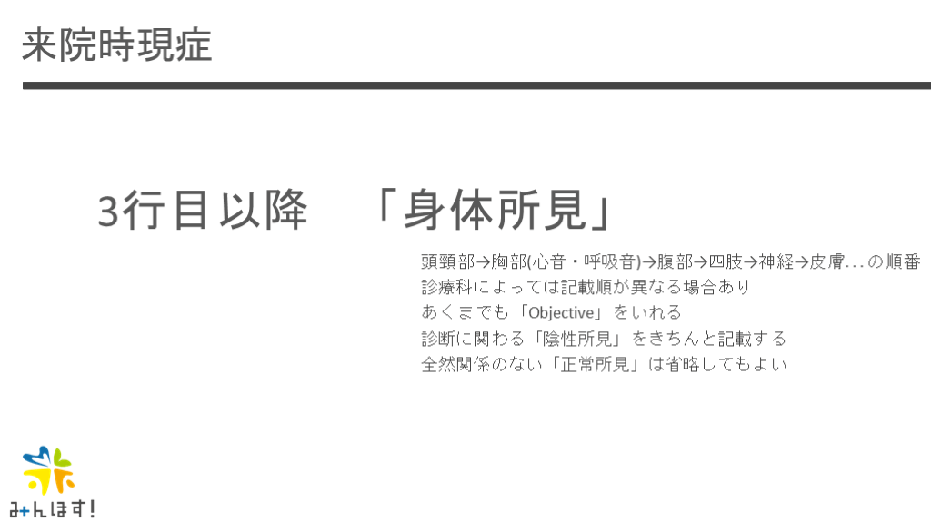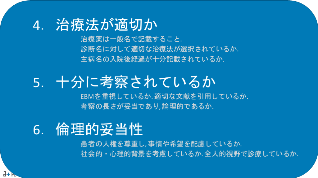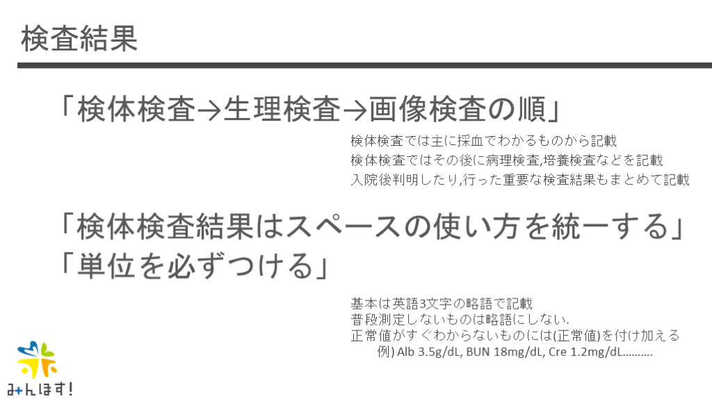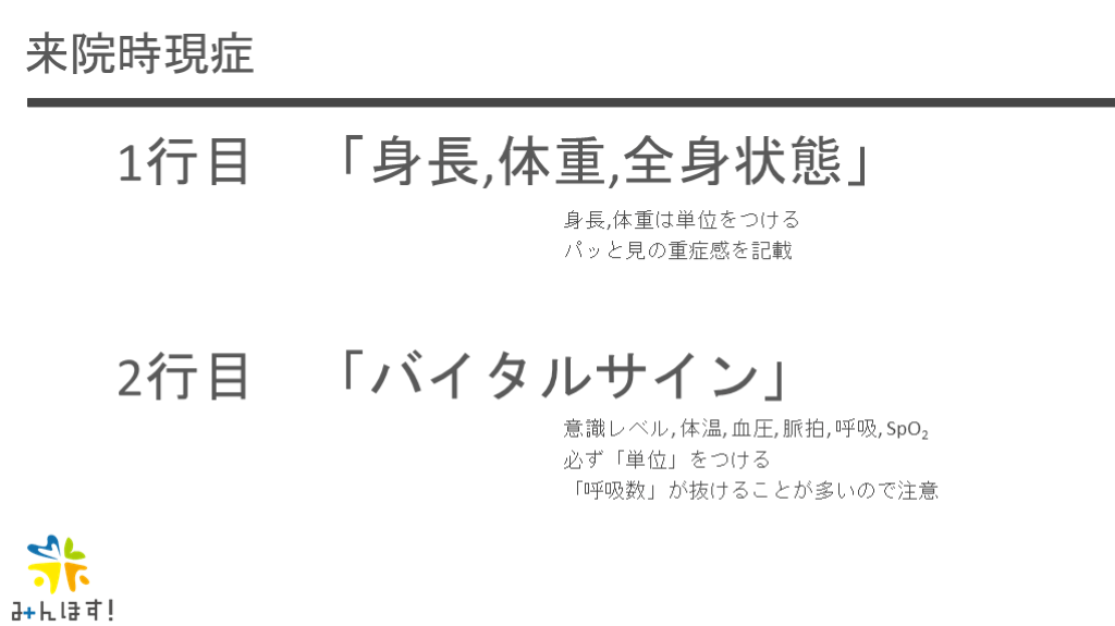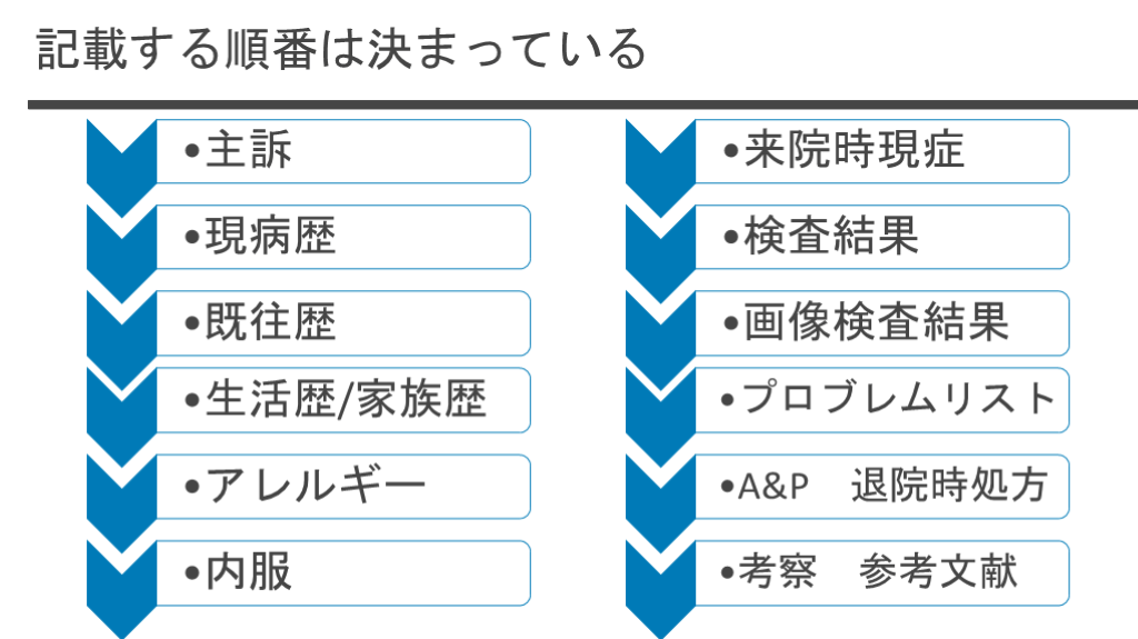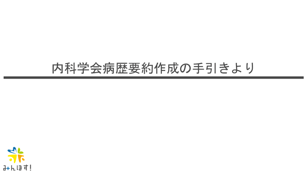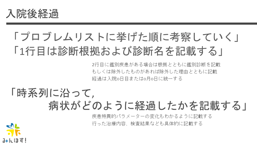 「1行目は診断根拠および診断名を記載する」 2行目に鑑別疾患がある場合は根拠とともに鑑別診断を記載 もしくは除外したものがあれば除外した理由とともに記載 経過は入院○日目または○月○日に統一する 「時系列に沿って, 病状がどのように経過したかを記載する」 疾患特異的パラメーターの変化もわかるように記載する 行った治療内容、検査結果なども具体的に記載する