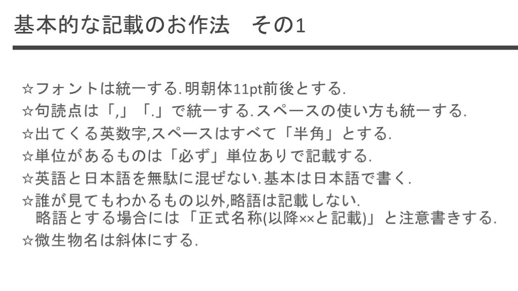 #13. 基本的な記載のお作法 その1 ☆フォントは統一する. 明朝体11pt前後とする.