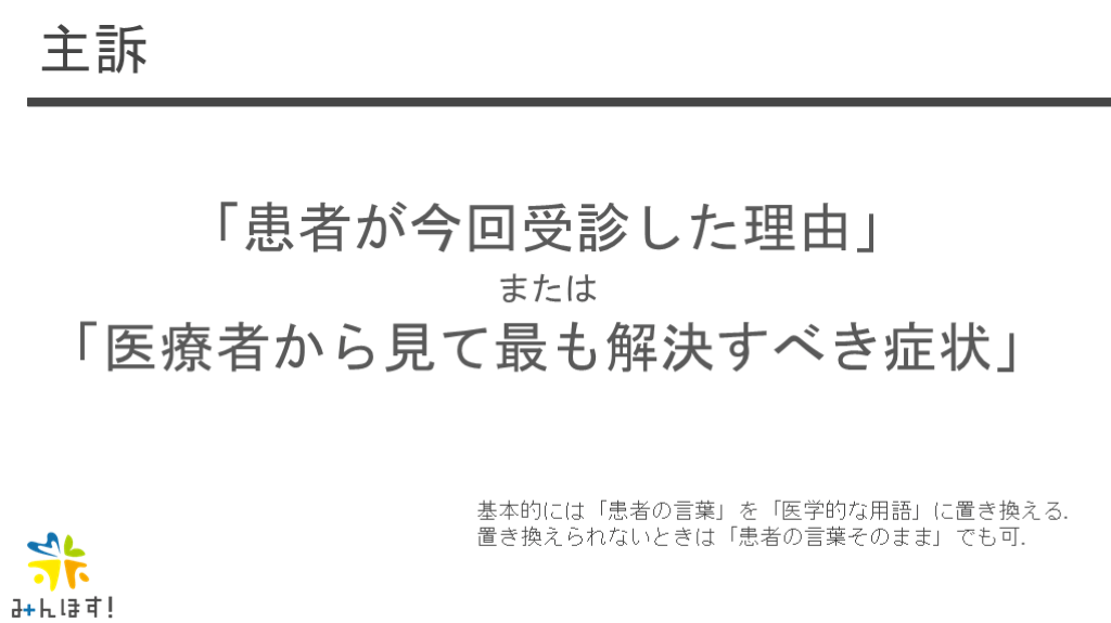 「医療者から見て最も解決すべき症状」 基本的には「患者の言葉」を「医学的な用語」に置き換える.