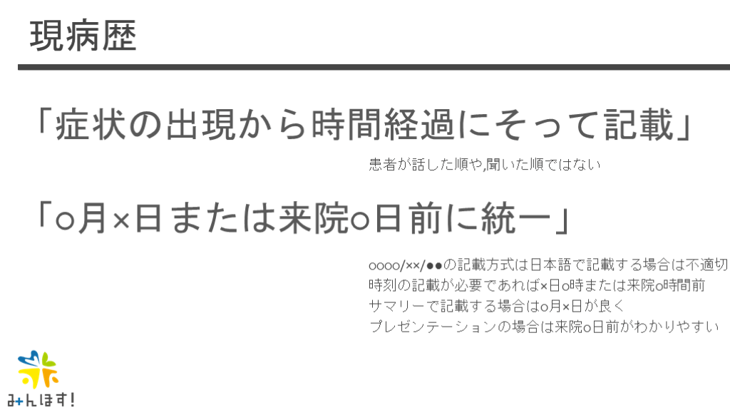 「○月×日または来院○日前に統一」 患者が話した順や,聞いた順ではない 時刻の記載が必要であれば×日○時または来院○時間前 ○○○○/××/●●の記載方式は日本語で記載する場合は不適切 サマリーで記載する場合は○月×日が良く プレゼンテーションの場合は来院○日前がわかりやすい