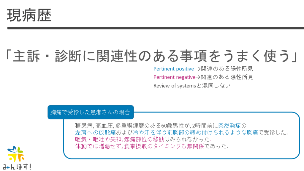 #20. 「主訴・診断に関連性のある事項をうまく使う」 現病歴 Pertinent positive →関連のある陽性所見 Pertinent negative→関連のある陰性所見 糖尿病, 高血圧, 多重喫煙歴のある60歳男性が, 2時間前に突然発症の左肩への放散痛および冷や汗を伴う前胸部の締め付けられるような胸痛で受診した.