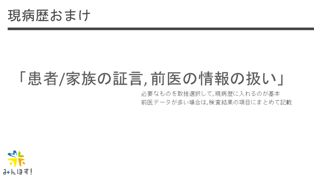 現病歴おまけ 必要なものを取捨選択して, 現病歴に入れるのが基本 前医データが多い場合は, 検査結果の項目にまとめて記載