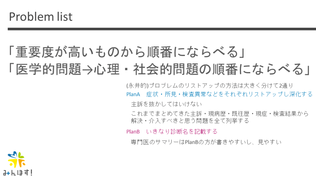 PlanB いきなり診断名を記載する (永井的)プロブレムのリストアップの方法は大きく分けて2通り PlanA 症状・所見・検査異常などをそれぞれリストアップし深化する 主訴を抜かしてはいけない これまでまとめてきた主訴・現病歴・既往歴・現症・検査結果から解決・介入すべきと思う問題を全て列挙する 専門医のサマリーはPlanBの方が書きやすいし、見やすい