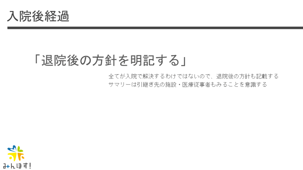 #45. 入院後経過 「退院後の方針を明記する」 全てが入院で解決するわけではないので、退院後の方針も記載する サマリーは引継ぎ先の施設・医療従事者もみることを意識する
