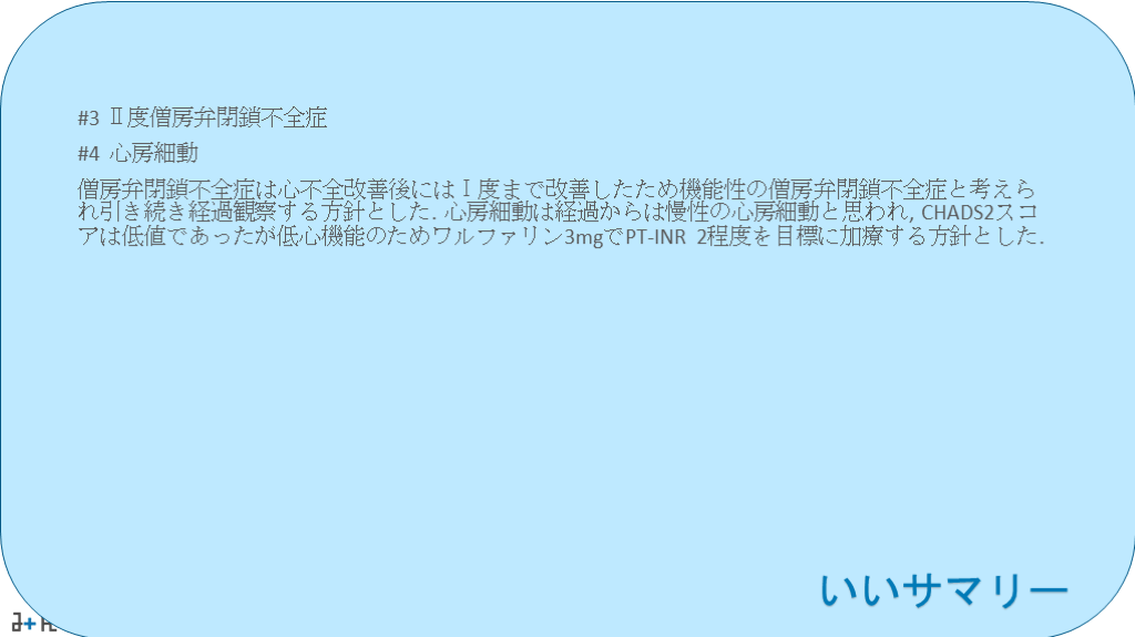 僧房弁閉鎖不全症は心不全改善後にはⅠ度まで改善したため機能性の僧房弁閉鎖不全症と考えられ引き続き経過観察する方針とした. 心房細動は経過からは慢性の心房細動と思われ, CHADS2スコアは低値であったが低心機能のためワルファリン3mgでPT-INR 2程度を目標に加療する方針とした. いいサマリー