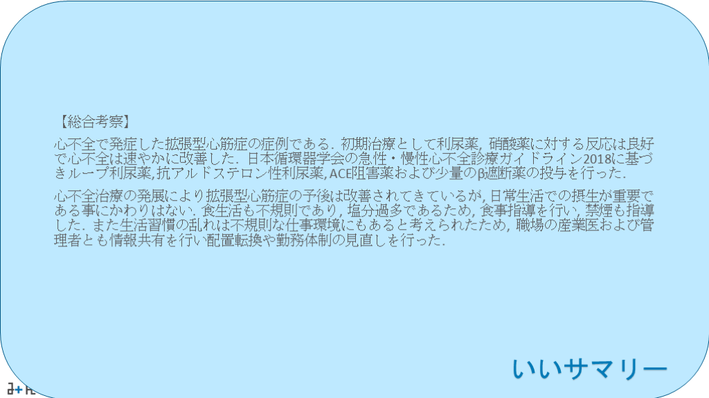 心不全治療の発展により拡張型心筋症の予後は改善されてきているが, 日常生活での摂生が重要である事にかわりはない. 食生活も不規則であり, 塩分過多であるため, 食事指導を行い, 禁煙も指導した. また生活習慣の乱れは不規則な仕事環境にもあると考えられたため, 職場の産業医および管理者とも情報共有を行い配置転換や勤務体制の見直しを行った. いいサマリー