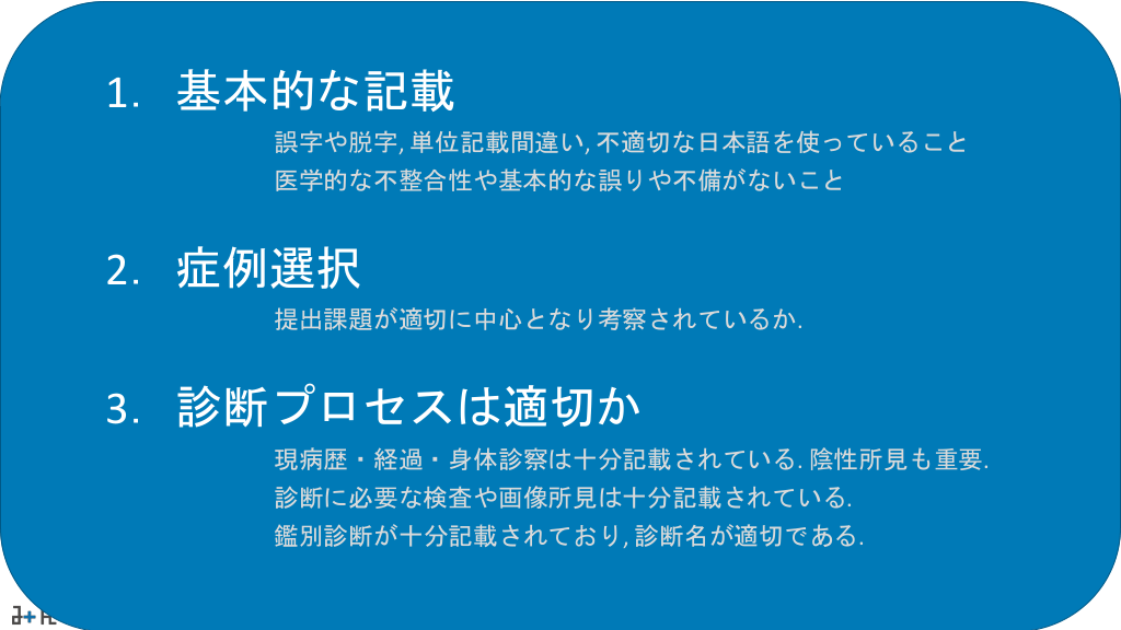 #10. 1.基本的な記載 誤字や脱字, 単位記載間違い, 不適切な日本語を使っていること 医学的な不整合性や基本的な誤りや不備がないこと 2.症例選択 提出課題が適切に中心となり考察されているか. 3.診断プロセスは適切か 現病歴・経過・身体診察は十分記載されている. 陰性所見も重要. 診断に必要な検査や画像所見は十分記載されている. 鑑別診断が十分記載されており, 診断名が適切である.
