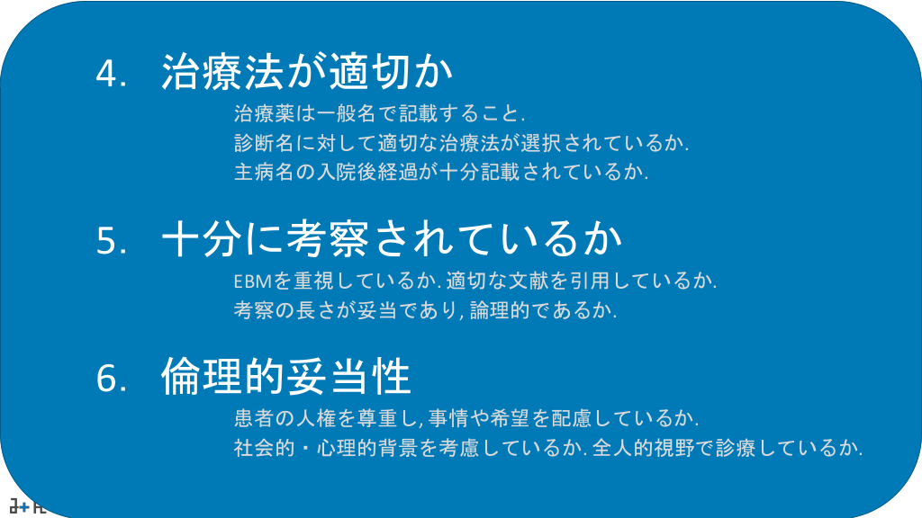 #11. 4.治療法が適切か 治療薬は一般名で記載すること. 診断名に対して適切な治療法が選択されているか. 主病名の入院後経過が十分記載されているか. 5.十分に考察されているか EBMを重視しているか. 適切な文献を引用しているか. 考察の長さが妥当であり, 論理的であるか. 6.倫理的妥当性 患者の人権を尊重し, 事情や希望を配慮しているか. 社会的・心理的背景を考慮しているか. 全人的視野で診療しているか.