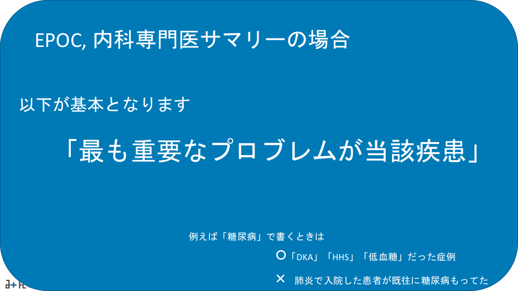 #12. EPOC, 内科専門医サマリーの場合 以下が基本となります 「最も重要なプロブレムが当該疾患」 例えば「糖尿病」で書くときは ○「DKA」「HHS」「低血糖」だった症例 × 肺炎で入院した患者が既往に糖尿病もってた