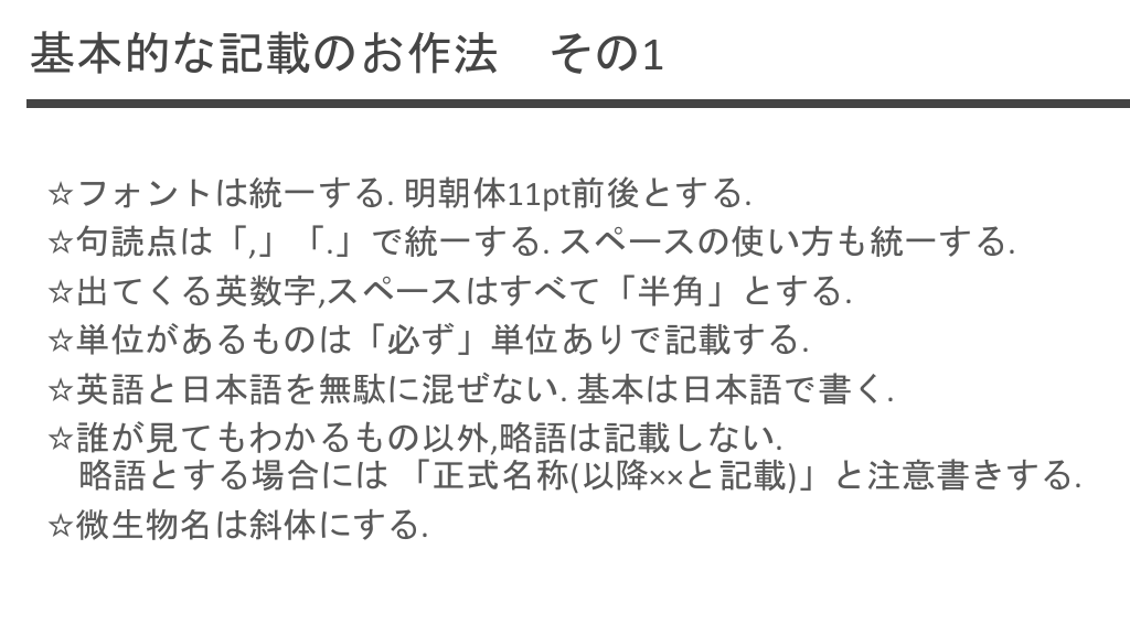 #14. 基本的な記載のお作法 その1 ☆フォントは統一する. 明朝体11pt前後とする. ☆句読点は「,」「.」で統一する. スペースの使い方も統一する. ☆出てくる英数字,スペースはすべて「半角」とする. ☆単位があるものは「必ず」単位ありで記載する. ☆英語と日本語を無駄に混ぜない. 基本は日本語で書く. ☆誰が見てもわかるもの以外,略語は記載しない. 略語とする場合には 「正式名称(以降××と記載)」と注意書きする. ☆微生物名は斜体にする.