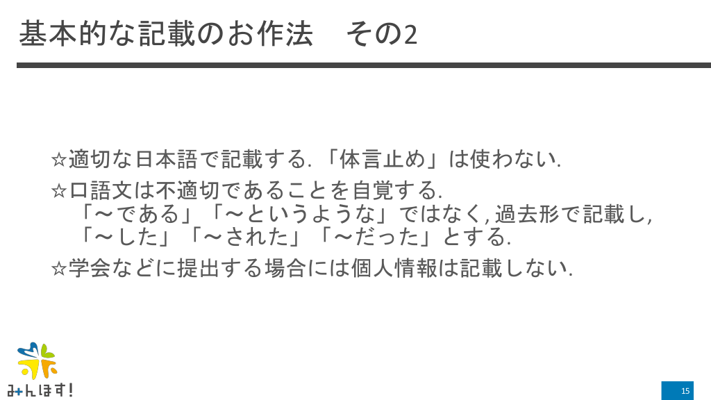 #15. 基本的な記載のお作法 その2 ☆適切な日本語で記載する. 「体言止め」は使わない. ☆口語文は不適切であることを自覚する. 「~である」「~というような」ではなく, 過去形で記載し, 「~した」「~された」「~だった」とする. ☆学会などに提出する場合には個人情報は記載しない. 15