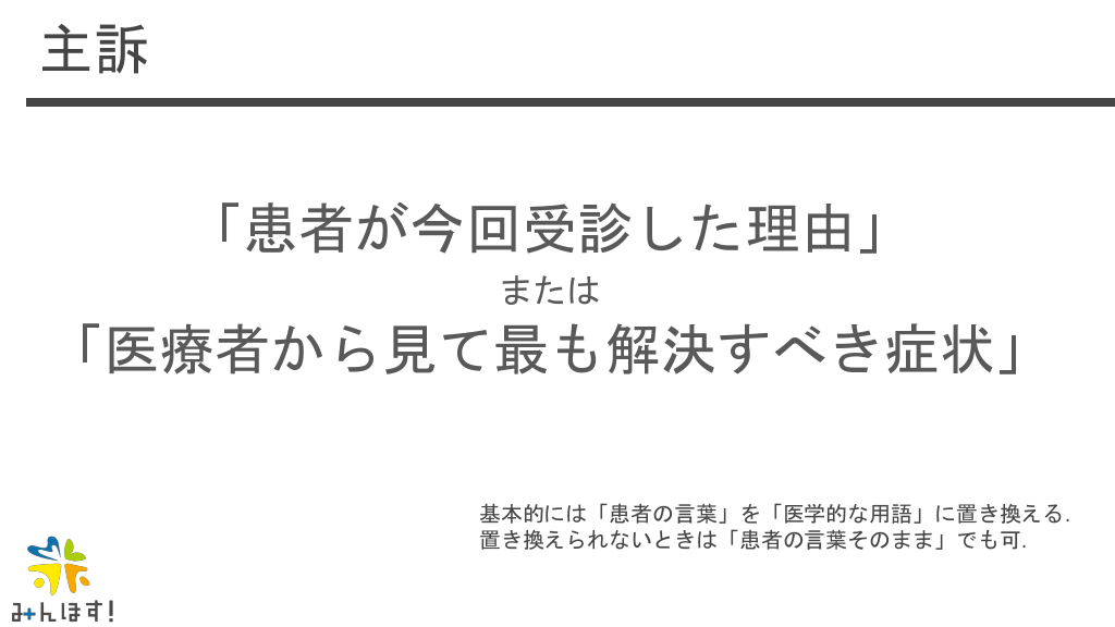 #18. 主訴 「患者が今回受診した理由」 または 「医療者から見て最も解決すべき症状」 基本的には「患者の言葉」を「医学的な用語」に置き換える. 置き換えられないときは「患者の言葉そのまま」でも可.