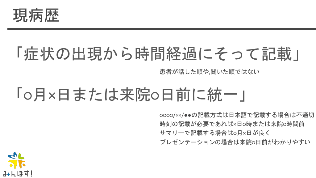 #19. 現病歴 「症状の出現から時間経過にそって記載」 患者が話した順や,聞いた順ではない 「○月×日または来院○日前に統一」 ○○○○/××/●●の記載方式は日本語で記載する場合は不適切 時刻の記載が必要であれば×日○時または来院○時間前 サマリーで記載する場合は○月×日が良く プレゼンテーションの場合は来院○日前がわかりやすい