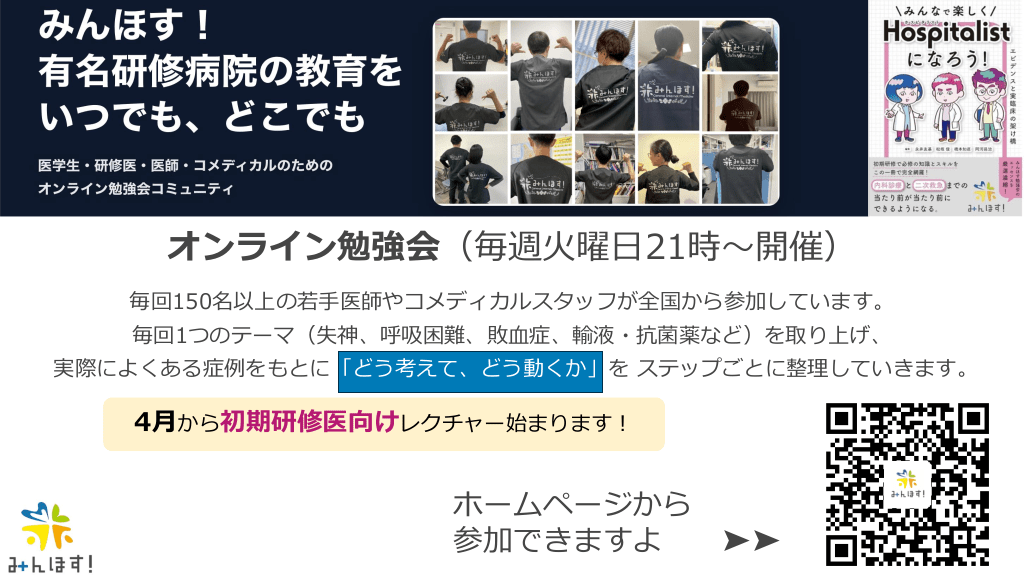 #56. オンライン勉強会(毎週火曜日21時〜開催) 毎回150名以上の若手医師やコメディカルスタッフが全国から参加しています。 毎回1つのテーマ(失神、呼吸困難、敗血症、輸液・抗菌薬など)を取り上げ、 実際によくある症例をもとに「どう考えて、どう動くか」を ステップごとに整理していきます。 4月から初期研修医向けレクチャー始まります! ホームページから 参加できますよ ➤➤
