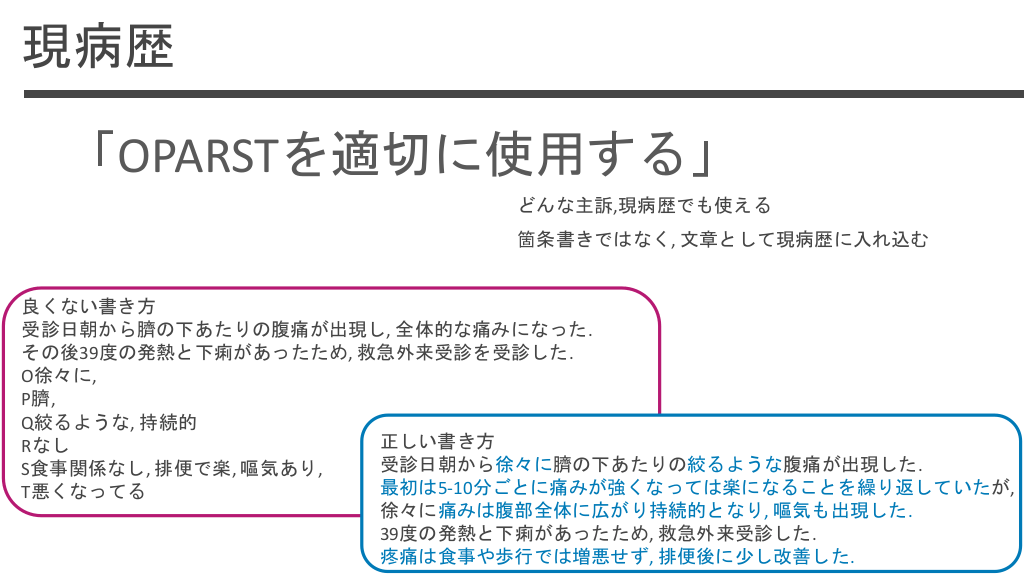 #21. 現病歴 「OPARSTを適切に使用する」 どんな主訴,現病歴でも使える 箇条書きではなく, 文章として現病歴に入れ込む 良くない書き方 受診日朝から臍の下あたりの腹痛が出現し, 全体的な痛みになった. その後39度の発熱と下痢があったため, 救急外来受診を受診した. O徐々に, P臍, Q絞るような, 持続的 正しい書き方 Rなし 受診日朝から徐々に臍の下あたりの絞るような腹痛が出現した. S食事関係なし, 排便で楽, 嘔気あり, 最初は5-10分ごとに痛みが強くなっては楽になることを繰り返していたが, T悪くなってる 徐々に痛みは腹部全体に広がり持続的となり, 嘔気も出現した. 39度の発熱と下痢があったため, 救急外来受診した. 疼痛は食事や歩行では増悪せず, 排便後に少し改善した.