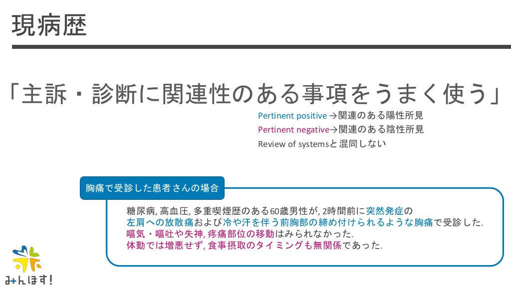 #22. 現病歴 「主訴・診断に関連性のある事項をうまく使う」 Pertinent positive →関連のある陽性所見 Pertinent negative→関連のある陰性所見 Review of systemsと混同しない 胸痛で受診した患者さんの場合 糖尿病, 高血圧, 多重喫煙歴のある60歳男性が, 2時間前に突然発症の 左肩への放散痛および冷や汗を伴う前胸部の締め付けられるような胸痛で受診した. 嘔気・嘔吐や失神, 疼痛部位の移動はみられなかった. 体動では増悪せず, 食事摂取のタイミングも無関係であった.