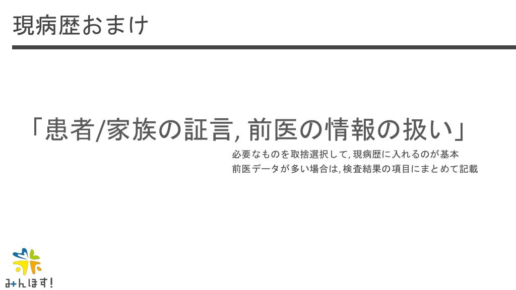 #23. 現病歴おまけ 「患者/家族の証言, 前医の情報の扱い」 必要なものを取捨選択して, 現病歴に入れるのが基本 前医データが多い場合は, 検査結果の項目にまとめて記載